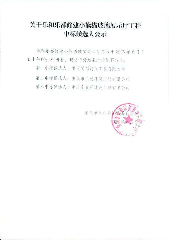 乐和乐都修建小熊猫玻璃展示厅工程中标候选人公示
