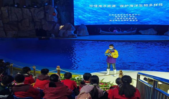 海豚与学生见面,海豚奶爸结合PPT科普海豚知识,着重保护海洋动物对于维护海洋生态平衡的重要意义