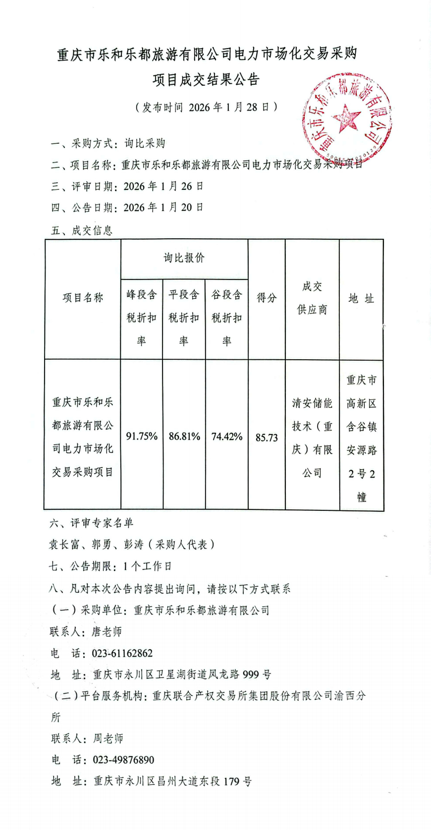 重庆市乐和乐都旅游有限公司电力市场化交易采购项目成交结果公告